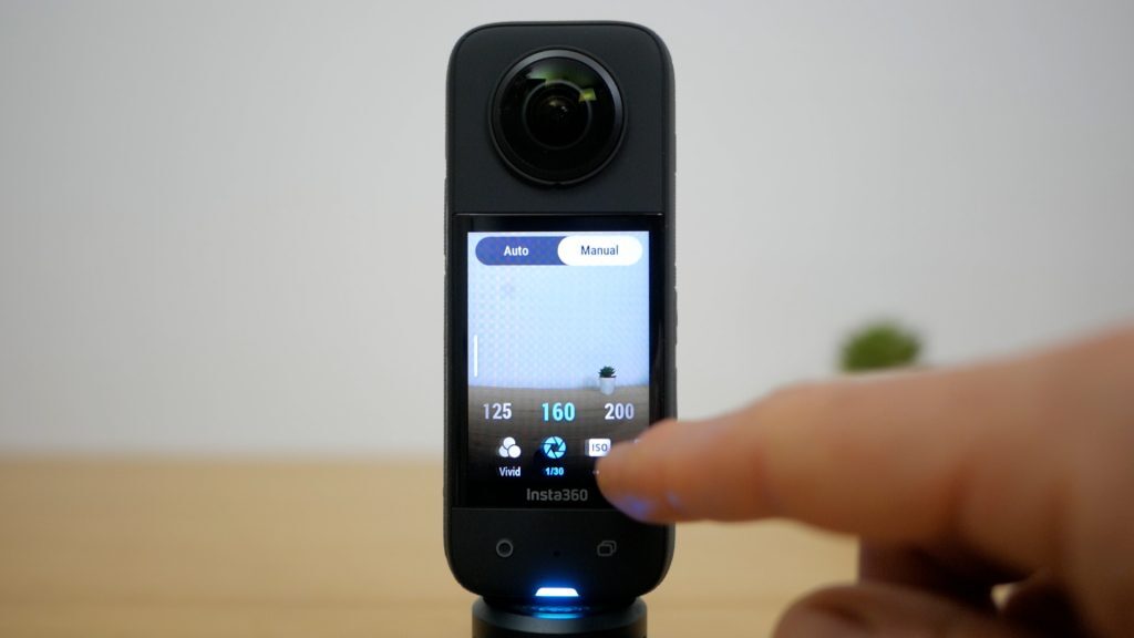 画面の右端からスワイプすると、カラー プロファイル、ホワイト バランス、露出補正などのビデオまたは写真の設定を構成できます。いろいろ試した結果、ビビッド モードとオート ホワイト バランスを使い続けることにしました。分離露出モードでは、各レンズが独自の露出を設定できるため、ステッチがより明確になる場合があります。X3 はほとんどの場合、自動モードで露出を設定する優れた機能を備えていますが、照明が非常に不均一で、前面レンズまたは背面レンズの映像を使用することがわかっている場合は、編集で継ぎ目を避けることができます。これはオプションかもしれません。マニュアルをタップすると、ISOとシャッタースピードも設定できます。