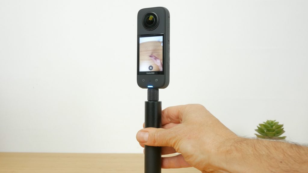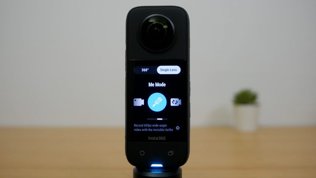 X3 には、Me モードと呼ばれるまったく新しいモードがあります。シングル レンズ モードでのみ使用できますが、実際には両方のレンズの下半分を使用してセルフィー ビデオを撮影します。キーフレームを作成する必要がないという考えですが、残念ながら、これでも各レンズのビデオが Insta360 独自の形式で記録され、アプリでつなぎ合わせる必要があります。カメラが自撮り棒に取り付けられ、各レンズの下半分が顔またはフレーム内の必要なものに向くように、ほぼ水平に保持されていることを確認する必要があります。残念ながら、このモードでは最大 1080p、60 fps でしか録画できません。