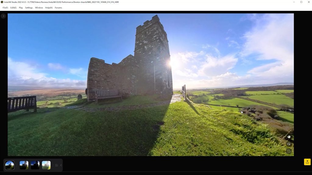 画面の左端からスワイプすると、フッテージを確認できます。360 度のフッテージは、再生中に指でドラッグできます。画面が大きいので、スマホを取り出さなくても使えます。私は今でも付属のアプリを使用して映像を確認し、編集していますが、360° 写真を設定するのに非常に便利です。しかし、X3 ではその必要性ははるかに少なくなります。