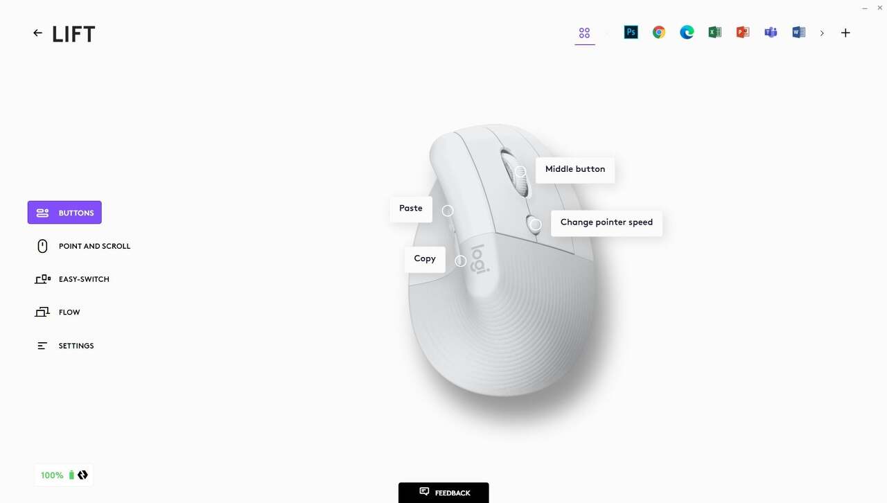 Lift は、何も手を加えずに使用できるように作られたシンプルなマウスのように感じられますが、Logitech の最新のハイエンド マウスに共通する幅広い機能を提供します。これには、 Options+ 構成ソフトウェアを使用したアプリ固有のボタン割り当てのカスタマイズが含まれます。